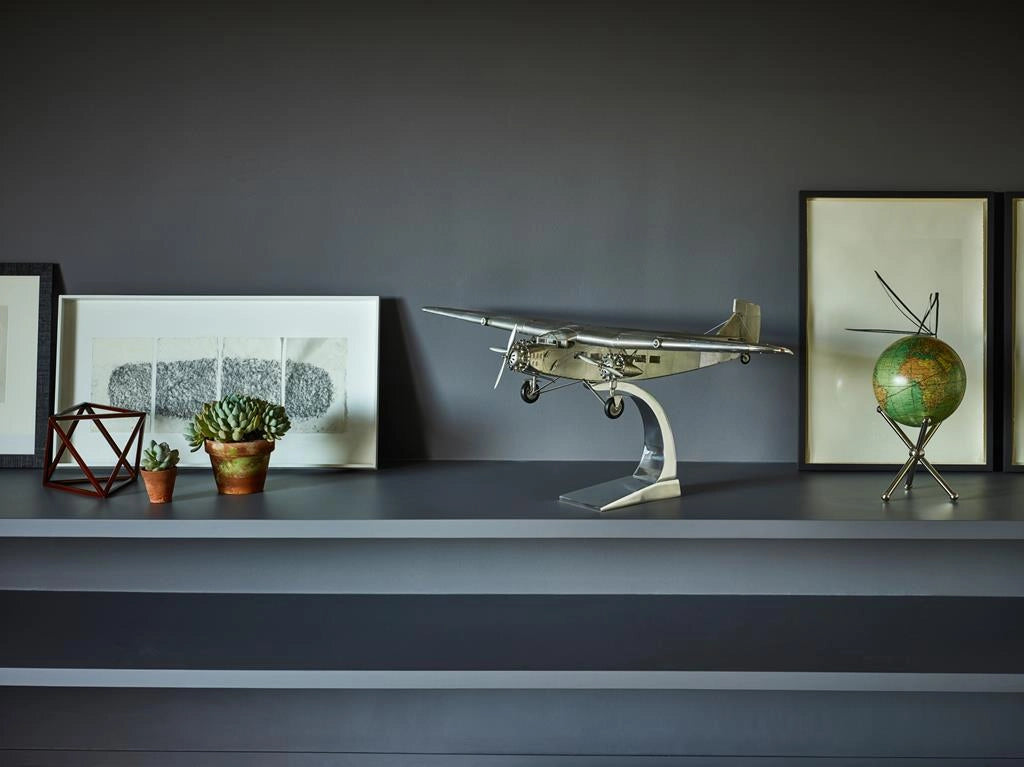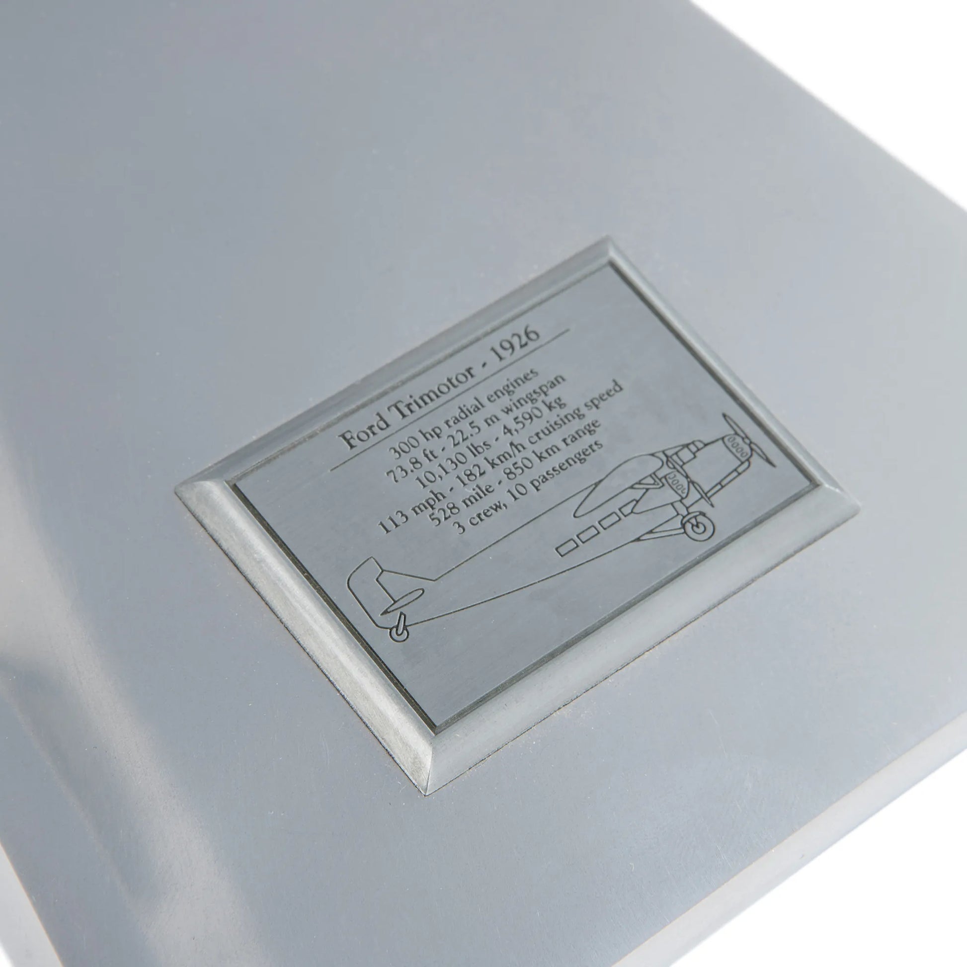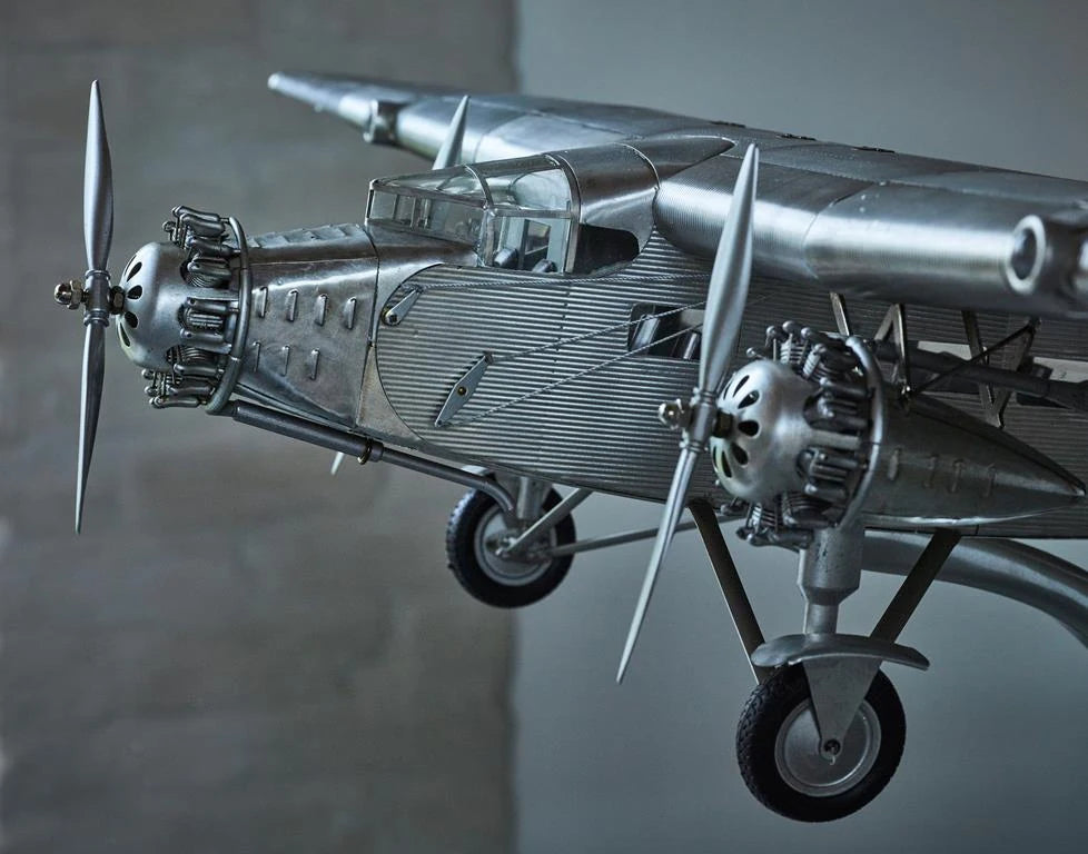 Pomiędzy 1926 a 1933 rokiem we własnej fabryce Forda zbudowano zaledwie 199 sztuk modelu Trimotor. Falista blacha na ogromnych, grubych skrzydłach jednopłatowca była niemieckim rozwiązaniem, stosowanym w maszynach Junker JU-52 latających na trasie Berlin-Rzym-Londyn. Trimotory były używane przez linie lotnicze, koncerny naftowe i bogatych przedsiębiorców. Ford Trimotor to pionierska maszyna lotnicza, która utorowała drogę kolejnym generacjom flot Douglasa i Boeinga. Wspaniały model gabinetowy w polerowanym srebrze.